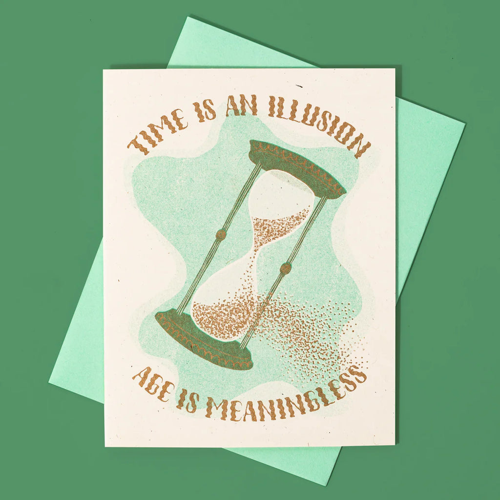 For the person who dislikes the march of time comes this comforting reminder that all of it is sort of made up. Grains of sand pour out of an hourglass to underscore the truth: time is an illusion, age is meaningless. Risograph printed in seafoam and metallic gold.