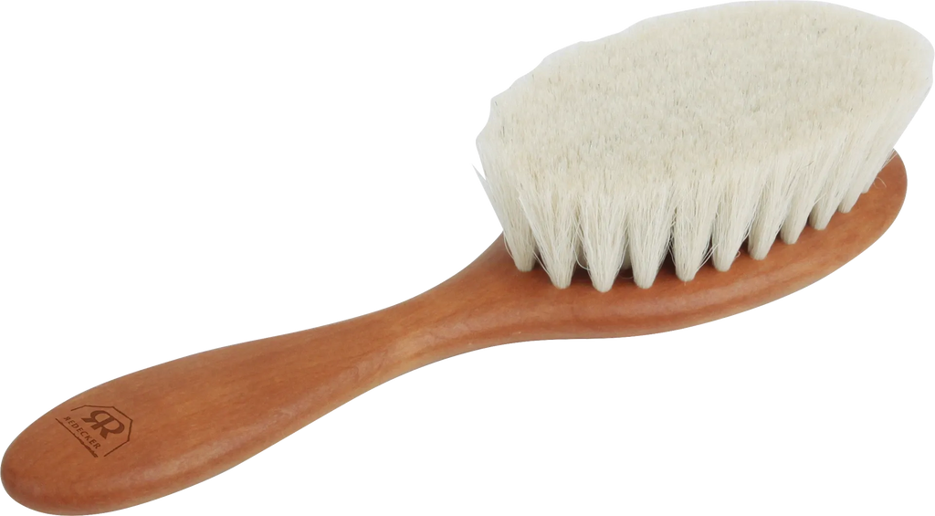 Beautifully hand crafted from oiled pearwood and set with softest goat hair for gentle brushing on sensitive new skin.