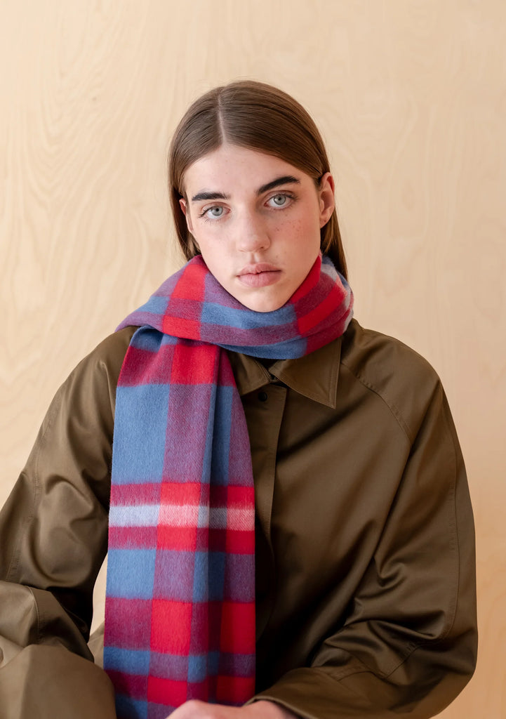 Merging timeless patterns with modern colours is what we do best. Elevate your outfit with this oversized fringed TBCo scarf, featuring a blue and red tartan check. It's woven from super soft 100% lambswool for optimised comfort and warmth. This natural fibre is renewable, biodegradable, thermo-regulating and breathable — better for you and for the planet.