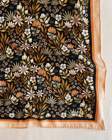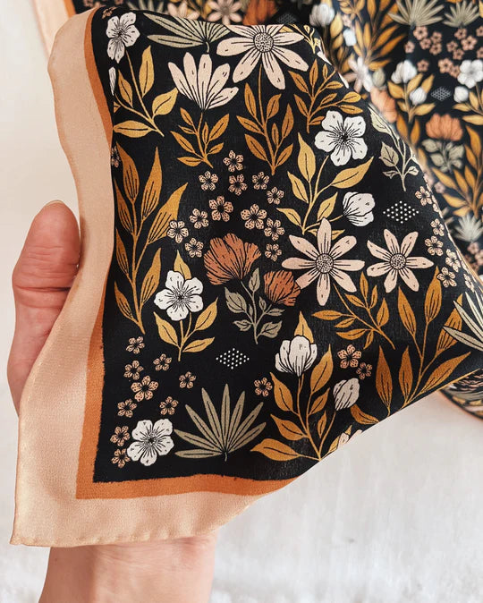 ‘Midnight Garden’ has lovely floral artwork that pops on its black background. Edges are finished with a beautiful hand rolled hem.