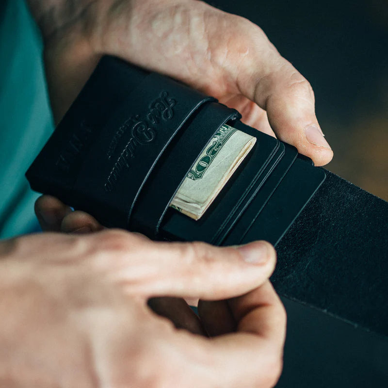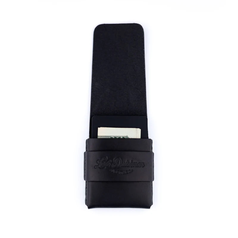 The Finnigan – the minimal card holder built to last a lifetime. Made 100% in the USA, this leather card wallet easily fits 8+ cards and folded cash, with a flap that keeps contents secure. All while remaining barely bigger than a credit card. With full-grain leather, a lifetime stitching guarantee, and endless customization, it's just wrong to settle for less. This is what true minimalism looks like.
