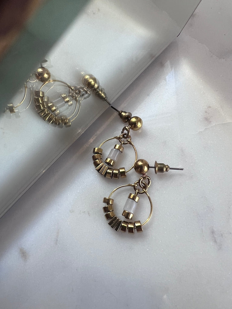 15mm mini hoops featuringHematite beads, and NaturalBlue Agate beads.Earrings: Stainless steel postsand brass studs