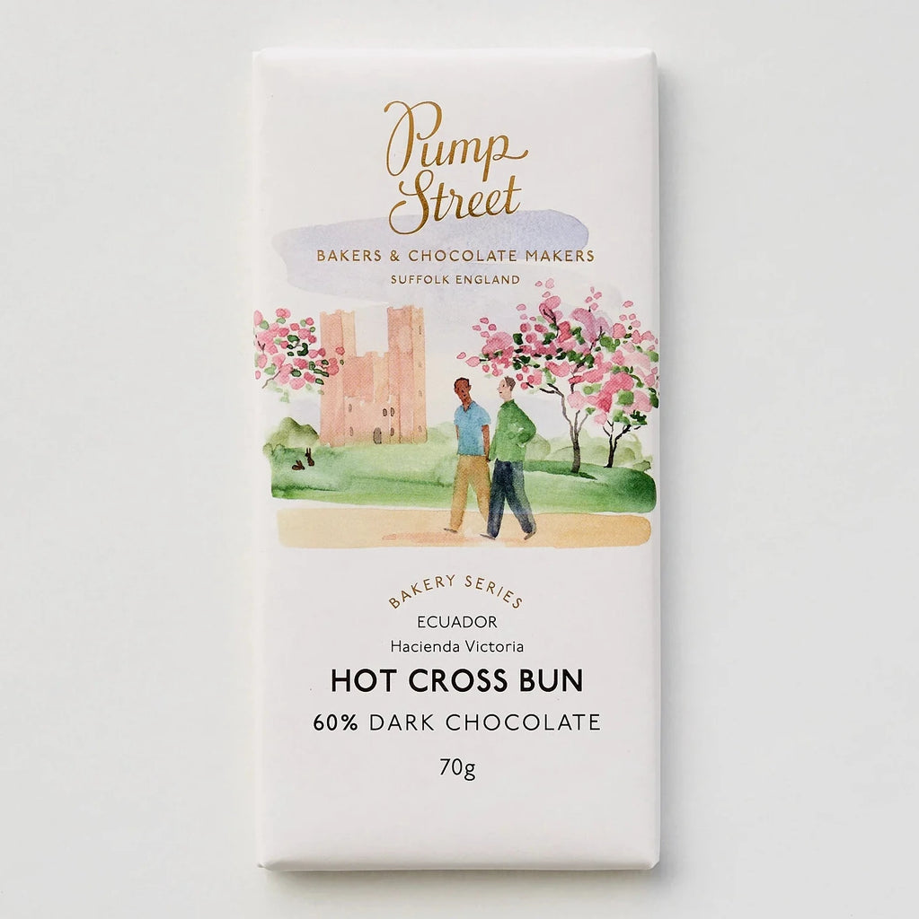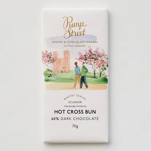 Ecuador Hot Cross Bun 60% is made with cocoa from Hacienda Victoria in Ecuador and Pump Street bakery's signature hot cross buns, scented with nutmeg, cloves and cinnamon. The bar is then, like the buns, studded with currants.