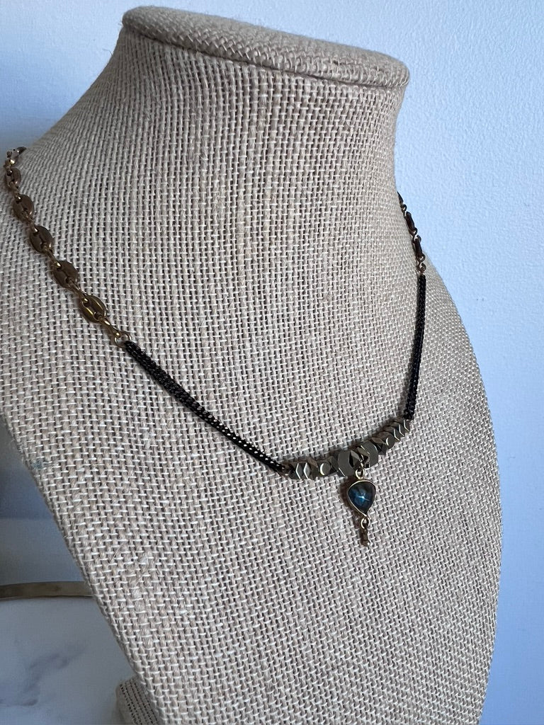 Collar length necklace on ovalbrass connector chain, blackbrass sparkle chain, andfeaturing a bar pendant withHematite beads and centering ateardrop shaped Labradoritegemstone.Length: 16.25” with 0.75”extender