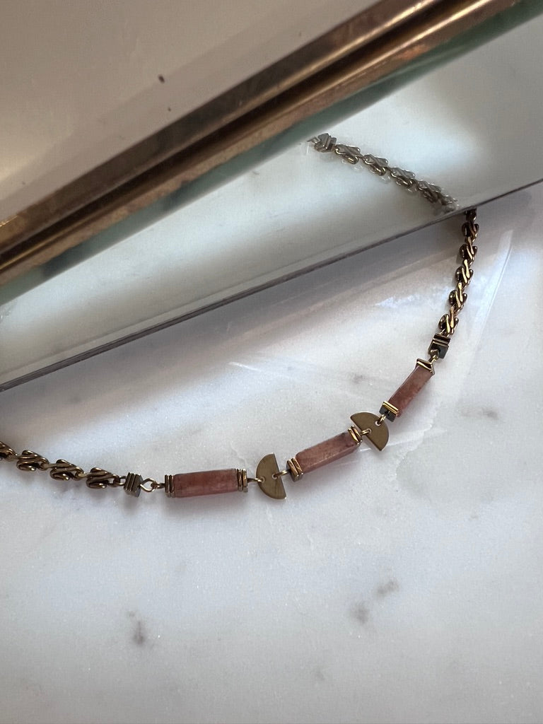 Collar length byzantine stylechain, featuring a bar pendantwith Red Aventurine, Hematite,and semi-circle charms.Length: 15.5” with 1” extender