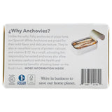 As populations of large apex-predator fish like tuna and swordfish plummet, anchovies and other forage fish can thrive with responsible harvest. Unlike the salty, fishy anchovy filets of pizza fame, our canned Spanish White Anchovies are prized for their mild flavor and delicate texture, and are hand-packed in extra-virgin olive oil. Anchovies are small, schooling fish, allowing us to enjoy seafood with the health and environmental benefits of eating lower on the food chain.