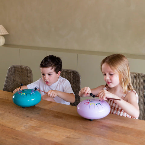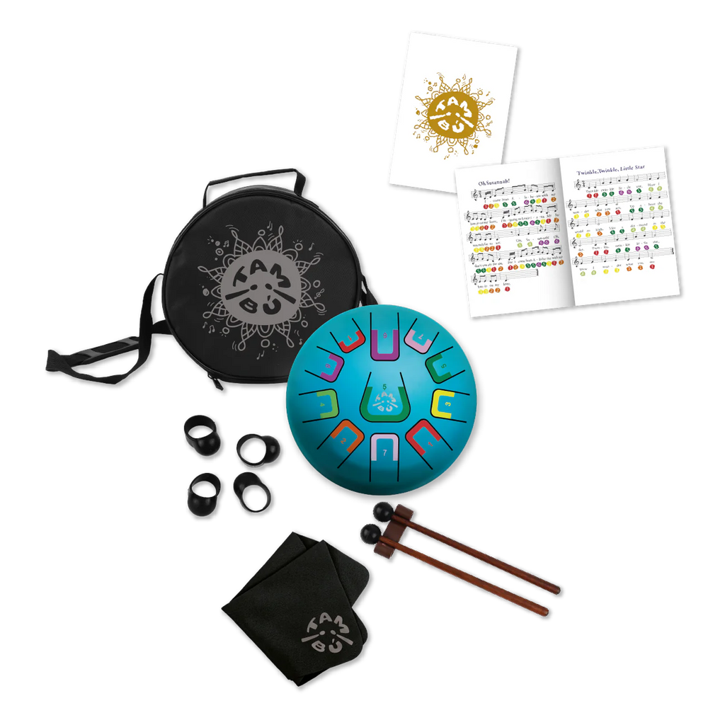 A beautiful sounding tool for introducing children to percussion instruments. 11 colour- and number-coded notes to strum with your hands, fingertips or drumsticks. Includes a carry bag, a sheet music booklet, 2 drumsticks and 4 finger picks. Washable with a soft and damp cloth. The tongue drum measures approximately 20cm in diameter.