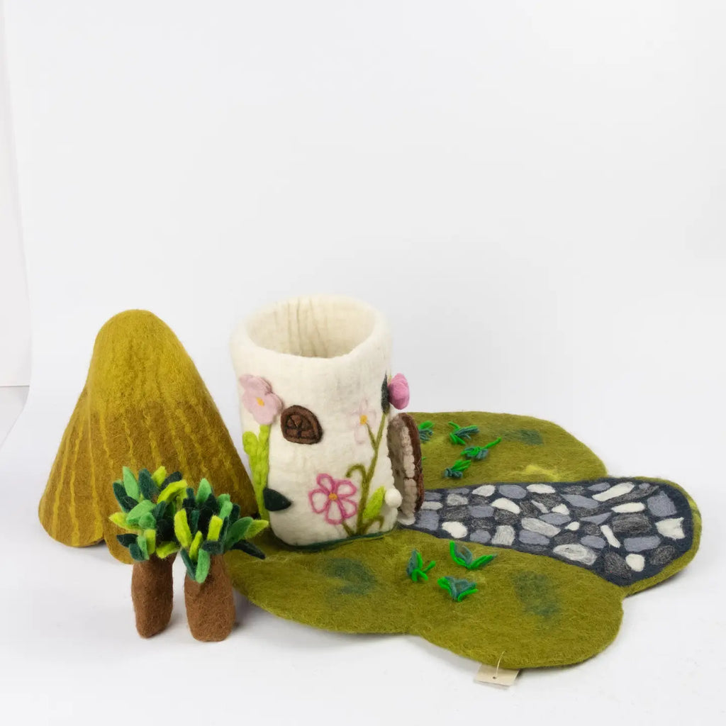 Country Cottage Felt Finger Puppet Playhouse! Hours of interactive playtime! Great way to merchandise the finger puppets in store! Removable roof so finger puppets can be stored inside after playtime.