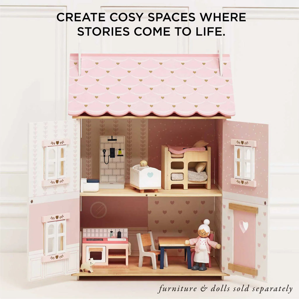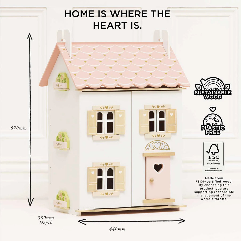 Welcome home. This delightful dolls house makes a stunning gift for a special little someone. Painted in fresh white with soft pink accents and gold heart motifs, it is ready to move right in to. Crafted from sustainable FSC® - certified wood, this durable, high quality toy features a scalloped roof, opening and closing doors and shutters for realistic play, plus a clever lift off roof that reveals access to a sweet attic bedroom. Inside, the floors are furnished in a lovely natural wood look to complement the lovely wallpaper designs in each room. Perfectly scaled to fit our full range of dolls and accessories (sold separately).