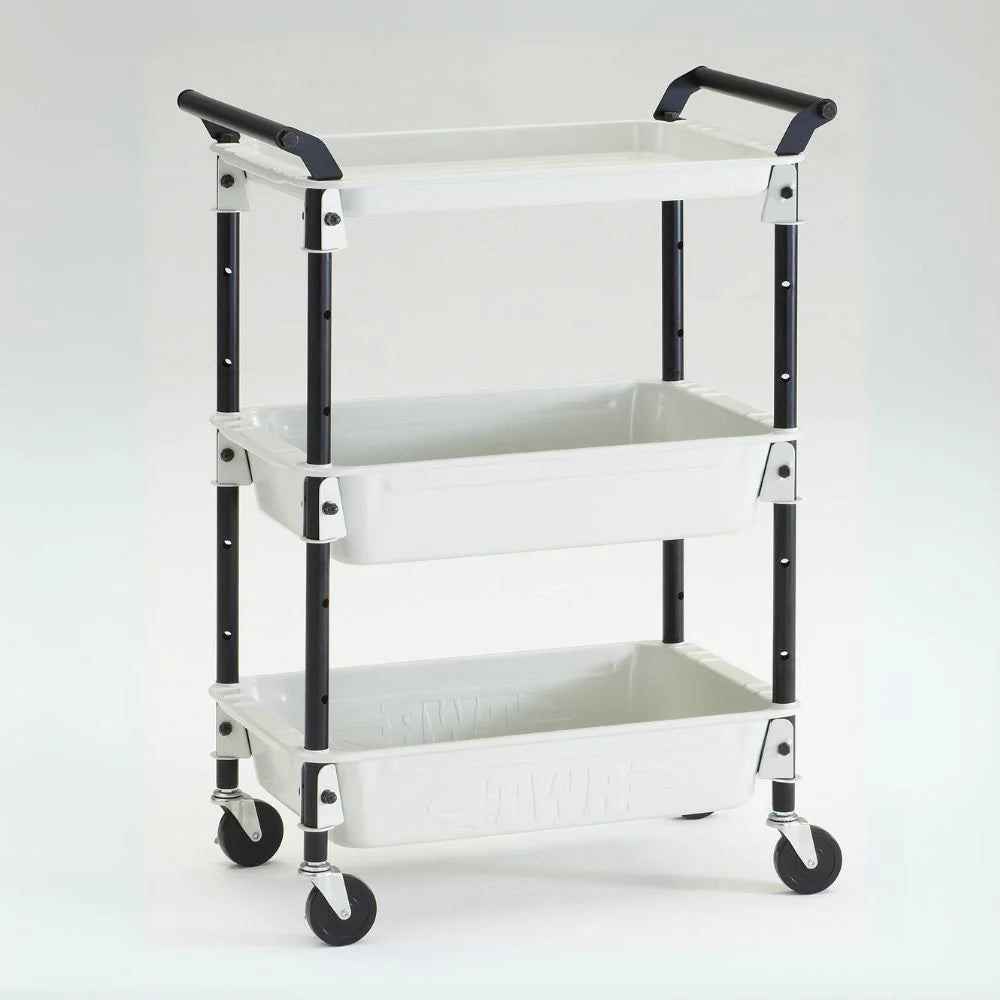 The TWR-4 Wagon from Toyo Steel. These Japan made wagons are made of one sheet with no joints, preventing spilled liquid from leaking. The shallow upper tray can be used for accessories and the and middle and lower deeper trays are perfect for organizing tools.