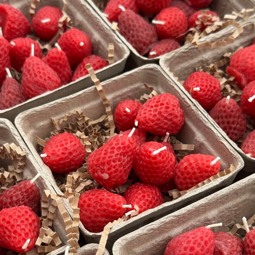 Adorable collection of beeswax strawberry candles in a cardboard basket.