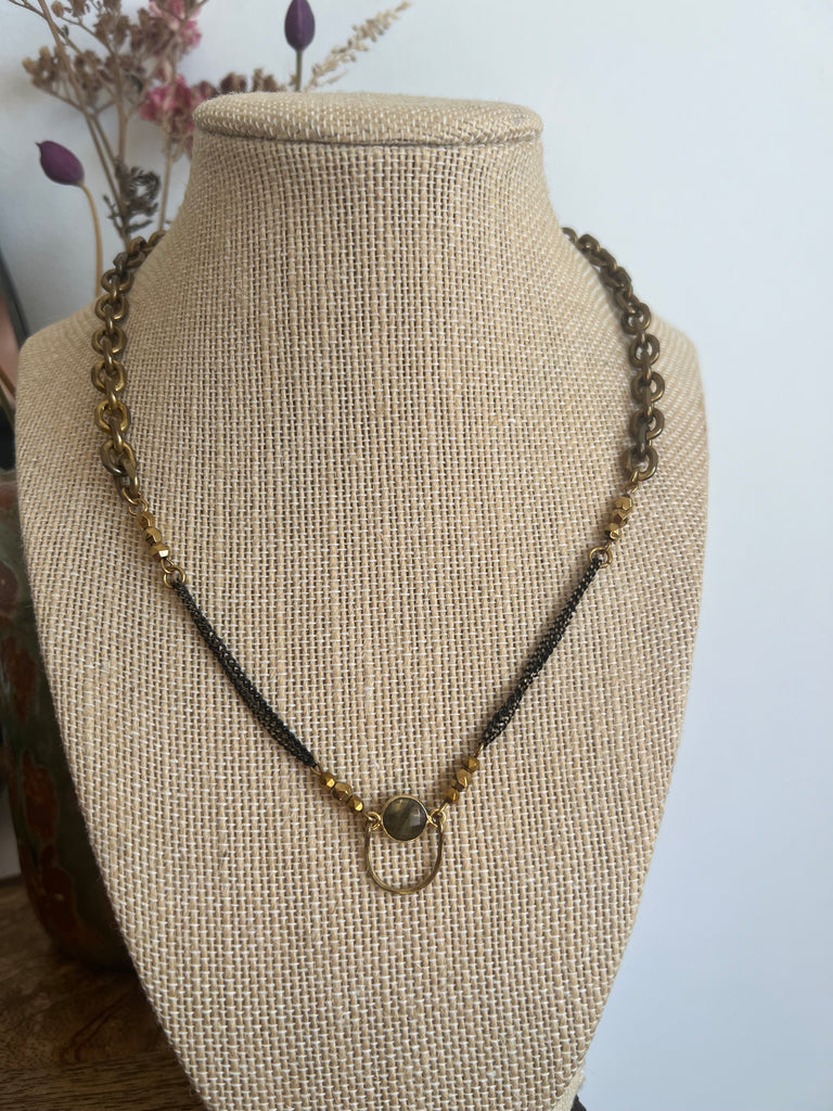 Collar length necklace featuringfaceted cable chain, Hematitebeads, black brass sparkle chainand a hand-hammered circlependant with Labradorite.