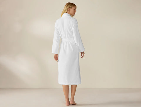 Inspired by Coyuchi's best-selling organic cotton Cloud Loom towels, this robe begins with the same long-staple cotton, loomed into single loops that feel thick and plush, yet lofty. The Aerospin process aligns the fibers in each yarn, making the robe just as soft and absorbent as our towels but a touch smoother and sleeker. The classic shawl-collared silhouette wraps cozily and features an adjustable belt and side pockets.