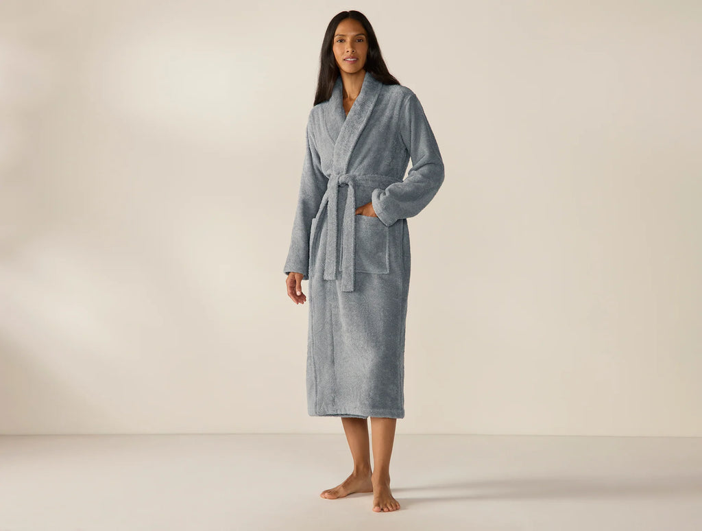 Inspired by Coyuchi's best-selling organic cotton Cloud Loom towels, this robe begins with the same long-staple cotton, loomed into single loops that feel thick and plush, yet lofty. The Aerospin process aligns the fibers in each yarn, making the robe just as soft and absorbent as our towels but a touch smoother and sleeker. The classic shawl-collared silhouette wraps cozily and features an adjustable belt and side pockets.